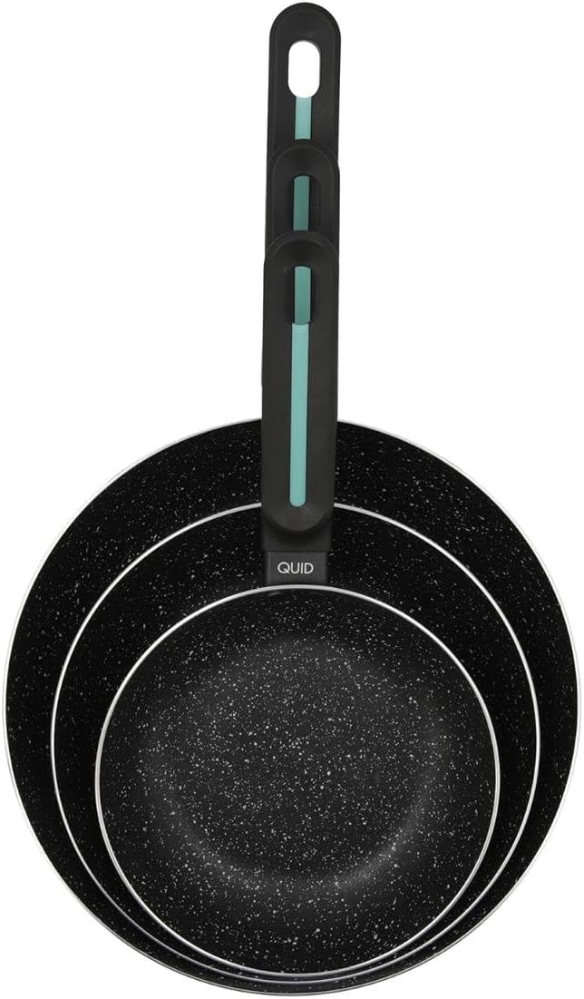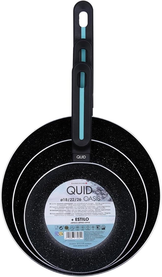 El set de sartenes QUID Lote3 Oasis 18-22-26 es un juego de tres sartenes de aluminio prensado en color negro, aptas para todo tipo de cocinas, incluida la inducción. Características Principales Este juego de sartenes de la marca QUID, modelo Oasis, está diseñado para ofrecer versatilidad en la cocina diaria. Material: Están fabricadas en aluminio prensado, un material conocido por ser un buen conductor del calor y por su ligereza. Compatibilidad: Son aptas para su uso en una amplia gama de superficies de cocción, incluyendo: Vitrocerámica Inducción Eléctrica Gas Limpieza: Son aptas para el lavavajillas, lo que facilita su limpieza. Diámetros: El set incluye tres sartenes de diferentes tamaños para adaptarse a diversas necesidades culinarias: 18 cm 22 cm 26 cm Revestimiento: Cuentan con un revestimiento antiadherente de calidad.